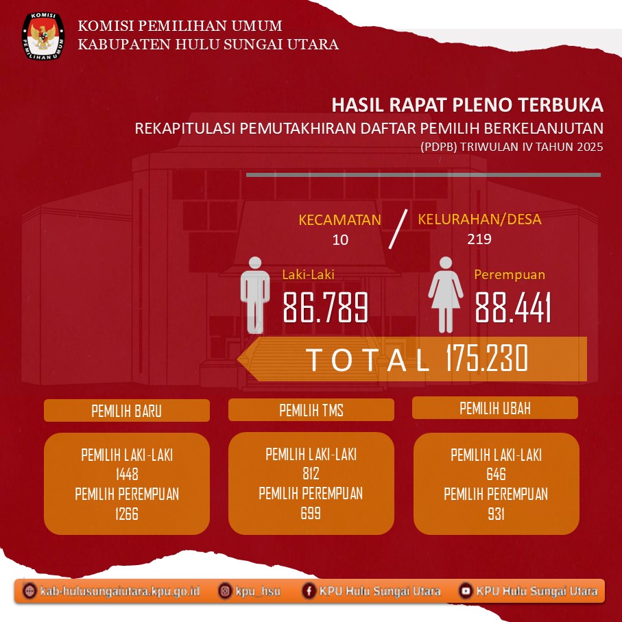 Pengumuman Pemutakhiran Data Pemilih Berkelanjutan (PDPB) Triwulan Keempat Tahun 2025 Senin, 08 Desember 2025 12:00 31 Klik disini untuk melihat Data Rekapitulasi Perkecamatan Bagikan: Dilihat 31 Kali.