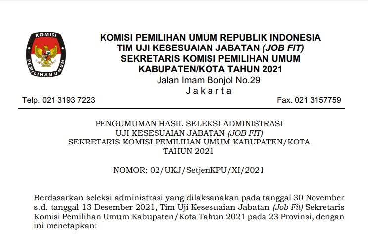 Berdasarkan seleksi administrasi yang dilaksanakan pada tanggal 30 November s.d. tanggal 13 Desember 2021, Tim Uji Kesesuaian Jabatan (Job Fit) Sekretaris Komisi Pemilihan Umum Kabupaten/Kota Tahun 2021 pada 23 Provinsi, dengan ini menetapkan sebagai berikut: klik disini