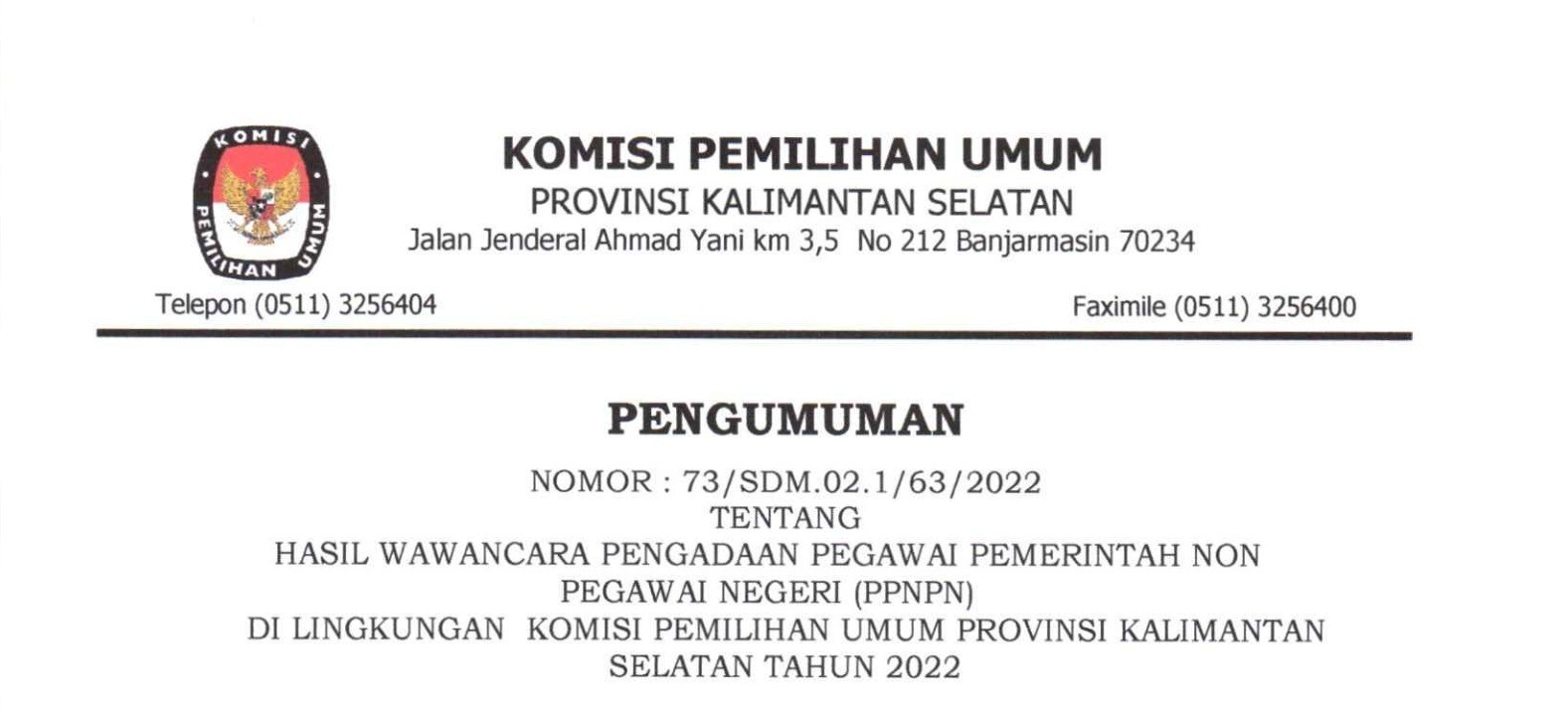 (Amuntai, 20 Januari 2022) Panitia Seleksi Pengadaan Pegawai Pemerintah Non Pegawai Negeri (PPNPN) KPU Provinsi Kalimantan Selatan menetapkan peserta yang lulus wawancara berdasarkan hasil Seleksi Wawancara Pengadaan Pegawai Pemerintah Non Pegawai Negeri (PPNPN) yang dilaksanakan pada tanggal 16 Januari 2022. (Tim KPUHSU)