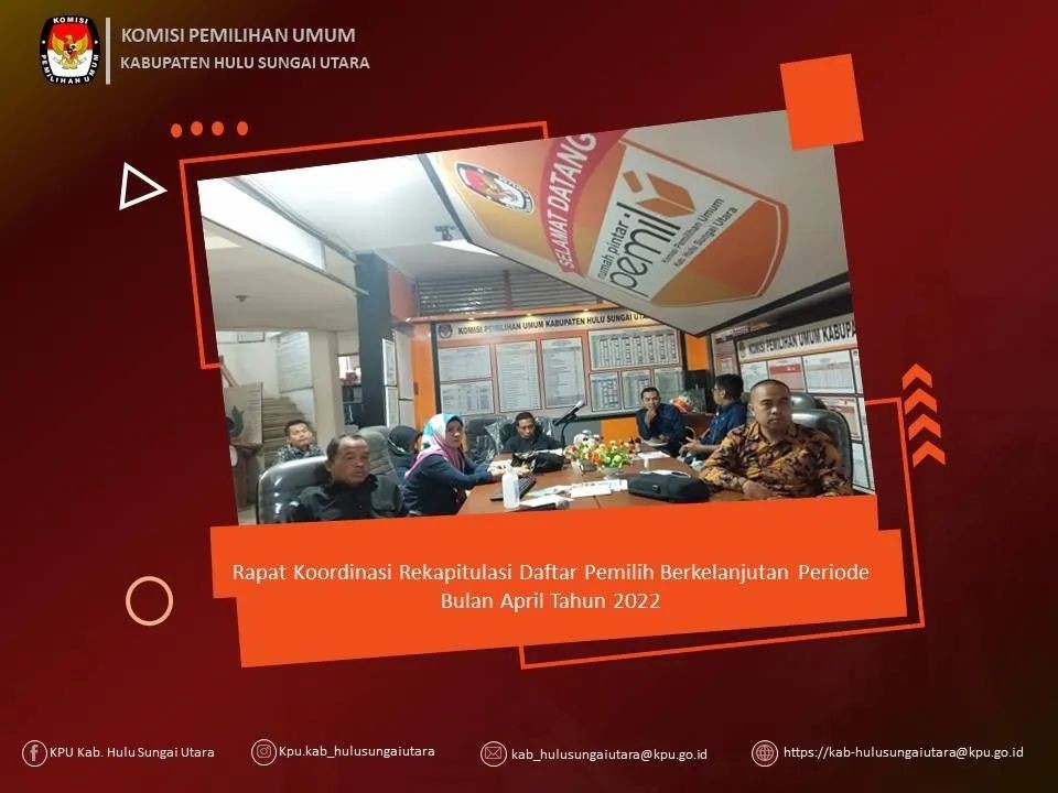 Selasa (10/5), KPU Kabupaten Hulu Sungai Utara mengikuti Rakoor Rekapitulasi Daftar Pemilih Berkelanjutan Periode Bulan April Tahun 2022 via zoom meeting. Acara ini diselenggarakan oleh Bagian Perencanaan, Data dan Informasi Program dan Data KPU Provinsi Kalimantan Selatan.