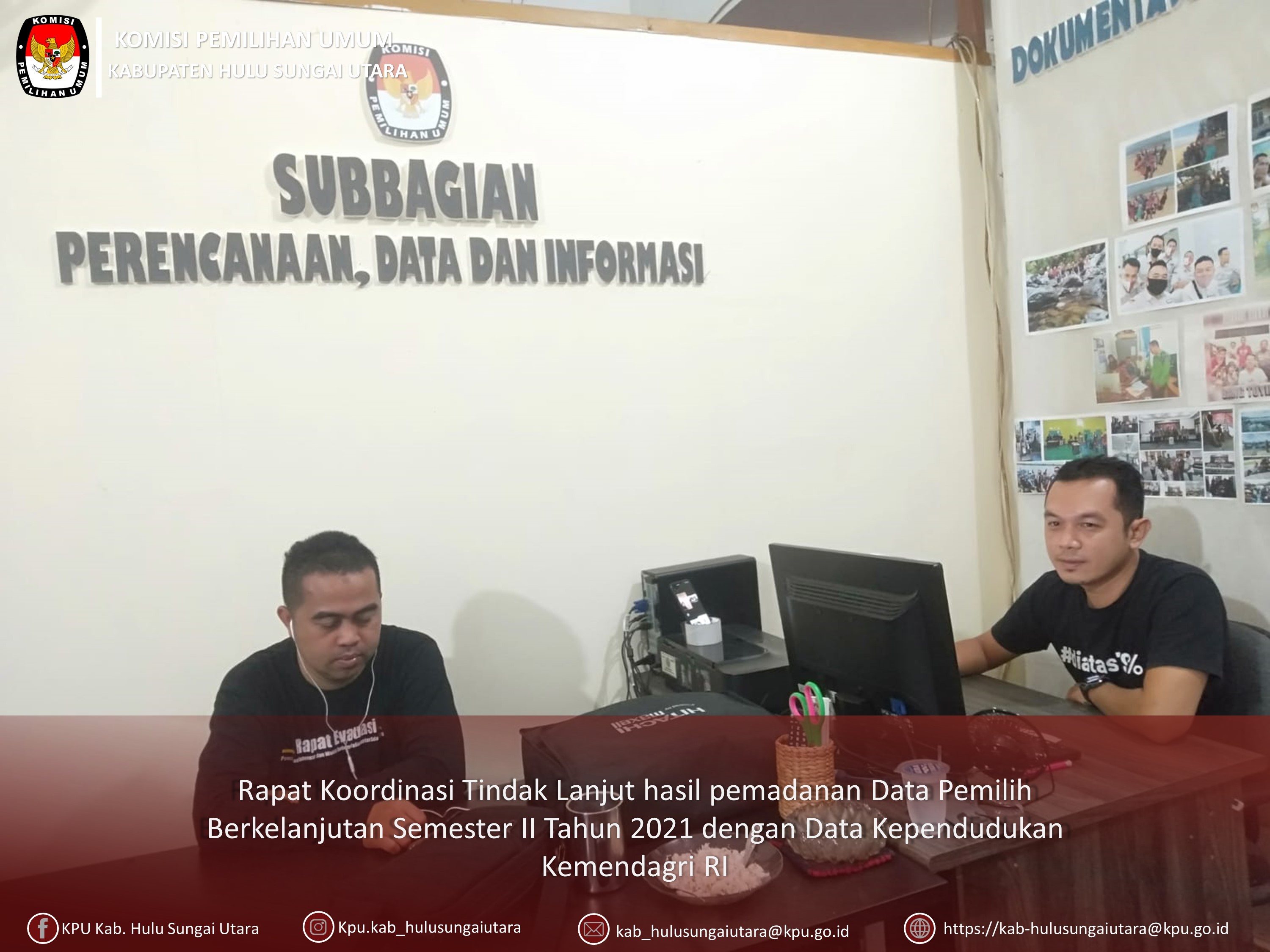 Jum’at (17/6) KPU Kabupaten Hulu Sungai Utara mengikuti acara Zoom Meeting Rapat Koordinasi Tindak Lanjut Hasil Pemadanan Data Pemilih Berkelanjutan Semester II Tahun 2021 dengan Data Kependudukan Kemendagri RI. Acara ini diselenggarakan KPU Provinsi Kalimantan Selatan dan Bagian Perencanaan, Data dan Informasi.