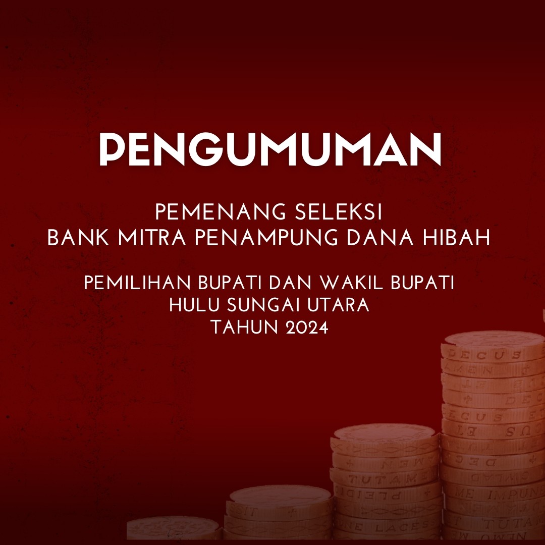 Berdasarkan Berita Acara Nomor 02/KU.07-BA/TIMSEL/2023 tentang Penetapan Pemenang Pemilihan Bank Mitra Penampung Dana Hibah Pemilihan Bupati dan Wakil Bupati Hulu Sungai Utara Tahun 2024, dengan ini Tim Seleksi menetapkan pemenang Beauty Contest Bank Mitra Penampung Dana Hibah Pemilihan Bupati dan Wakil Bupati Hulu Sungai Utara Tahun 2024 sebagai berikut :
