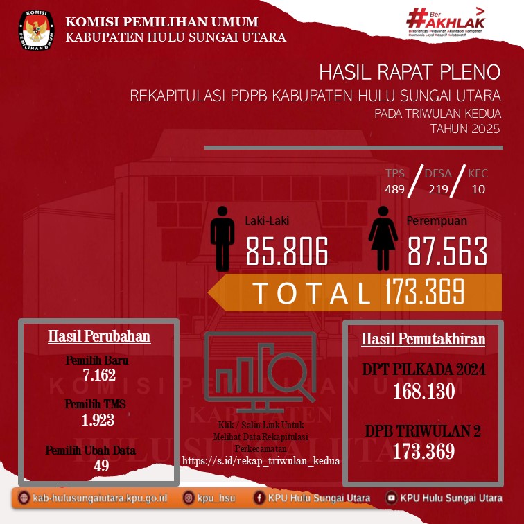 Pengumuman Pemutakhiran Data Pemilih Berkelanjutan (PDPB) Triwulan Kedua Tahun 2025 Rabu, 02 Juli 2025 15:30 51 Klik disini untuk melihat Data Rekapitulasi Perkecamatan Bagikan: Dilihat 51 Kali.